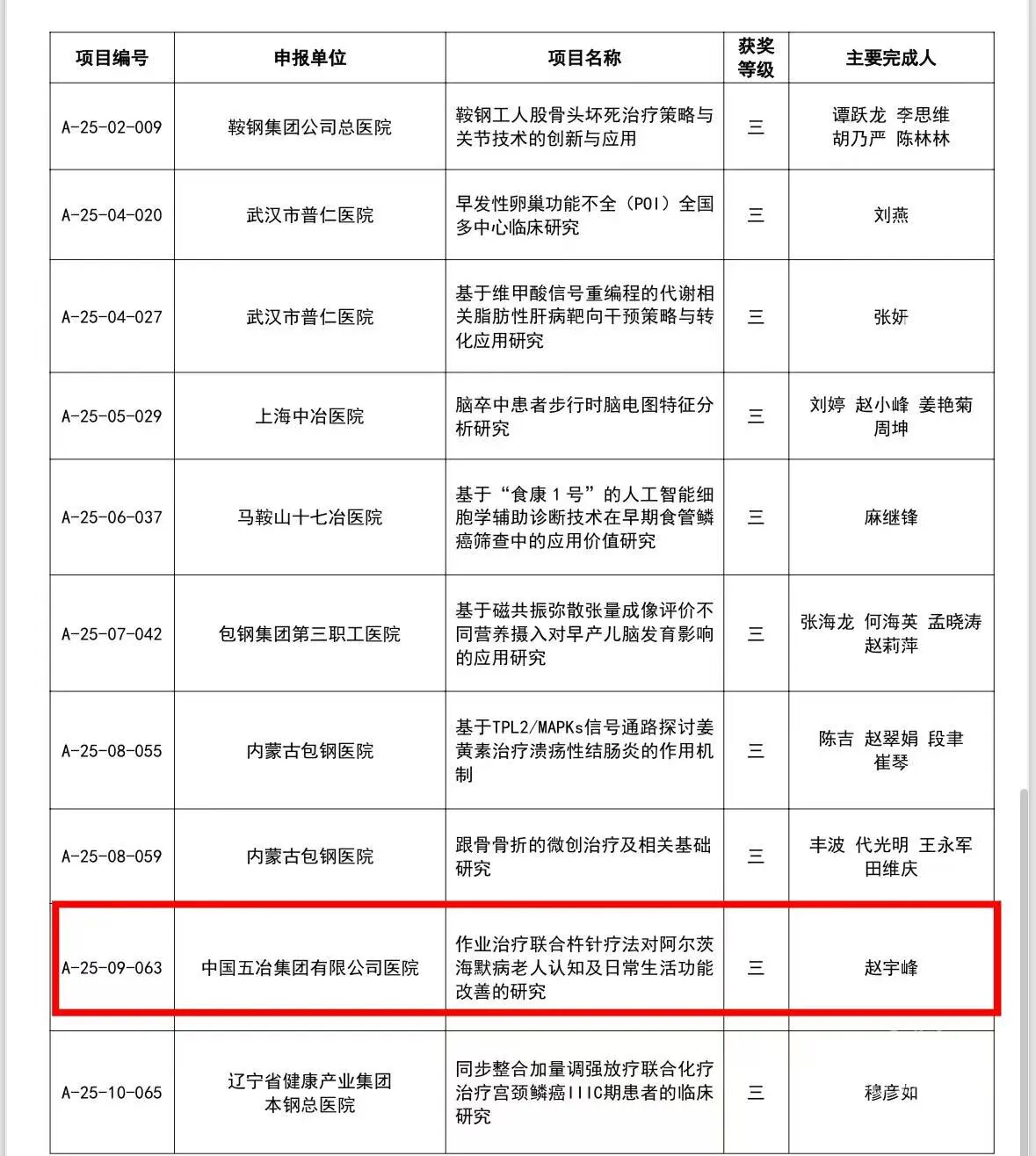 近日,2025年度“中国金属学会冶金医学奖”获奖项目正式公示,五冶医院康复医学二科赵宇锋团队的科研项目《作业治疗联合杵针疗法阿尔兹海默病老人认知及日常生活功能改善的研究》,凭借鲜明的中西医结合与扎实的临床价值荣获三等奖,为科室科研成果再添亮色。