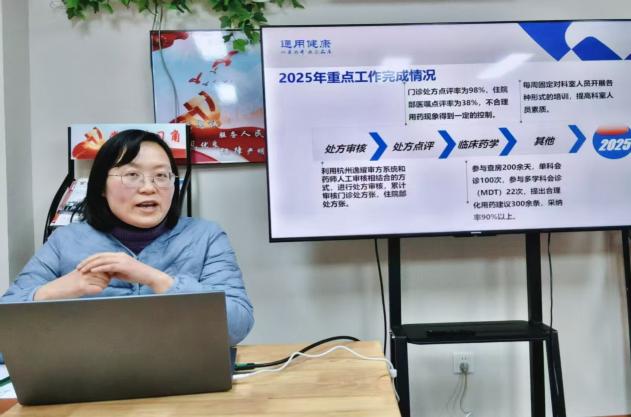 东区药房组长赵红燕随后作报告。她以详实的数据展示了门急诊与住院药房全年巨大的调剂工作量,介绍了在优化发药流程、提升窗口服务满意度等方面的具体举措。同时,她清晰地阐述了2026年在智能化服务与精细化管理方面的初步计划。