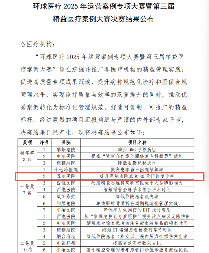 本次大赛聚焦精益管理创新与运营升级,旨在推广优秀实践、沉淀高质量成果,打造可复制的精益标杆。我院参赛案例紧扣“精益医疗”核心,立足临床与运营痛点,融入大数据等创新手段优化全流程,其中“提升医院出院患者 30 天门诊复诊率”项目获得一等奖,“降低妇科DRG亏损病例占比”项目获得三等奖,“提升体检客户胃肠镜检查引流量”、“降低住院患者输液率”、“提升门诊人次增长率”荣获优秀奖。